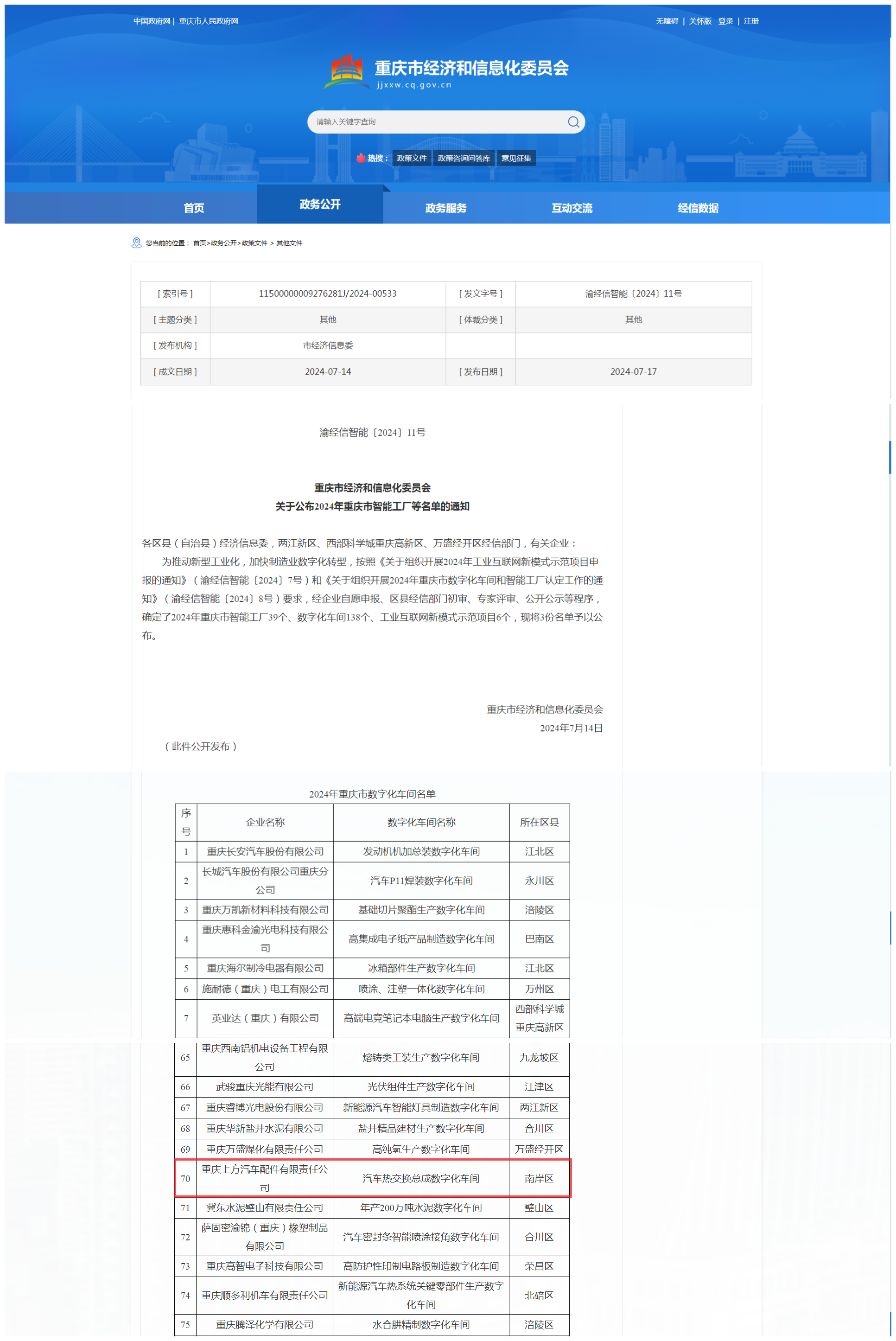 近日,重庆市经信委公示了2024年重庆市数字化车间、智能工厂和工业互联网新模式示范项目名单,上方公司“汽车热交换总成数字化车间”成功入选重庆市数字化车间名单。