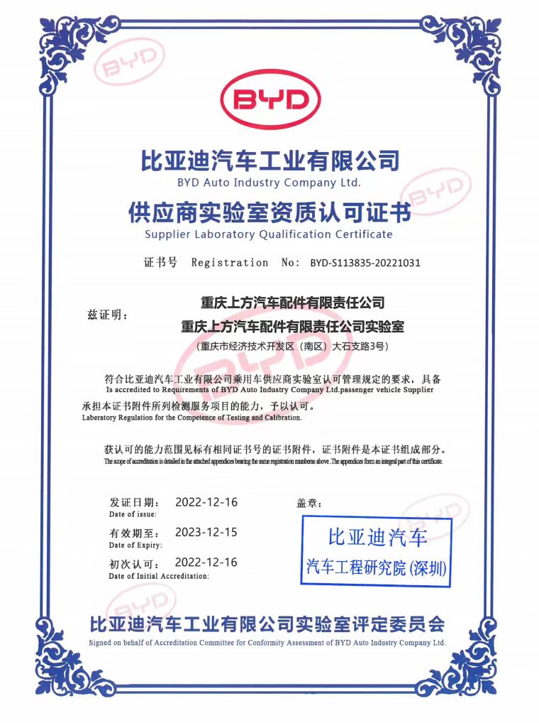 12月16日,上方公司实验室顺利通过比亚迪汽车工程研究院审核验收,资质的取得体现了比亚迪对上方公司产品技术检测能力、质量管理能力、创新能力、实验设备、工作团队等整体综合实力的信任与肯定,为公司产品质量信誉度再添砝码。